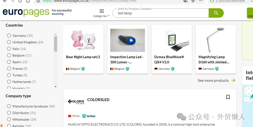 这个也是欧洲的一个批发商平台,算是一个B2B平台吧,在上面可以找批发商,制造商,而且有60多万个公司可以查询。还是不错的。查出来的企业信息也比较丰富,比如:公司名,地址,电话,社交媒体等,还可以在线给他们写信。想要做推广的朋友可以提交看看自己产品,说不定能吸引到主动找上门的买家。