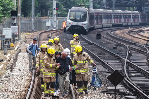 A man is escorted by firemen on train tracks at Sha Tin MTR station after rioters disrupted train services in Hong Kong on Tuesday. Hong Kong has again descended into chaos and violence since Monday after rioters blocked roads, set fires on streets and vandalized MTR trains, which greatly inconvenienced ordinary people. Photo: AFP