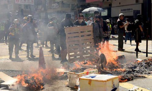 Black-clad rioters set fire on a street in Sai Wan Ho in Hong Kong on Monday. Photo: Xinhua