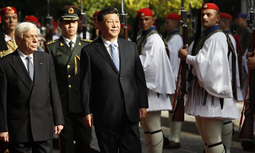 Chinese President Xi Jinping (center) and Greek President Prokopis Pavlopoulos inspect the honor guard of Evzones, the Greek Presidential guards, outside the Presidential palace in Athens, Greece on Monday. President Xi is in Greece on a two-day state visit. Photo: AP