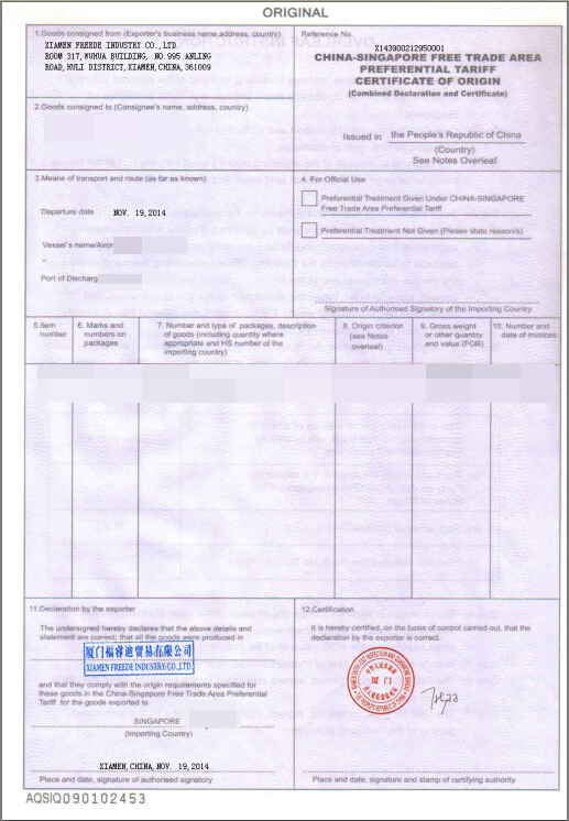 China-Singapore Free Trade Area Preferential Tariff Certificate of Origin