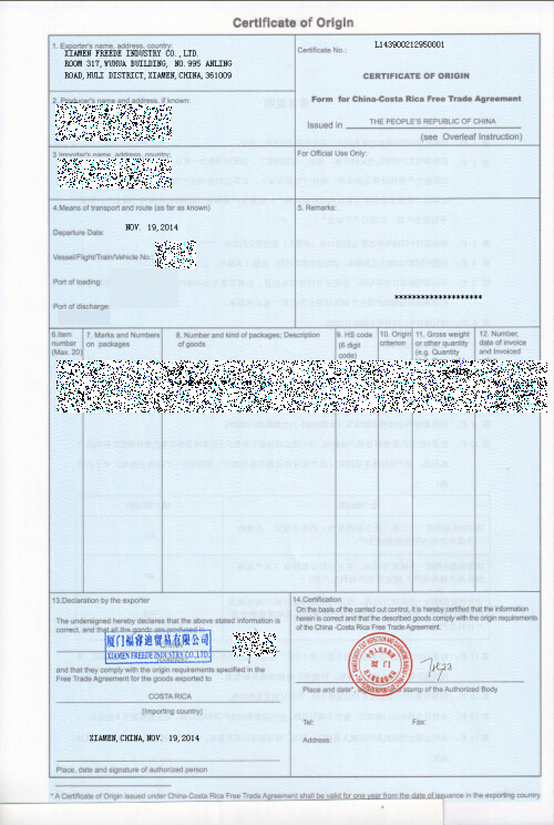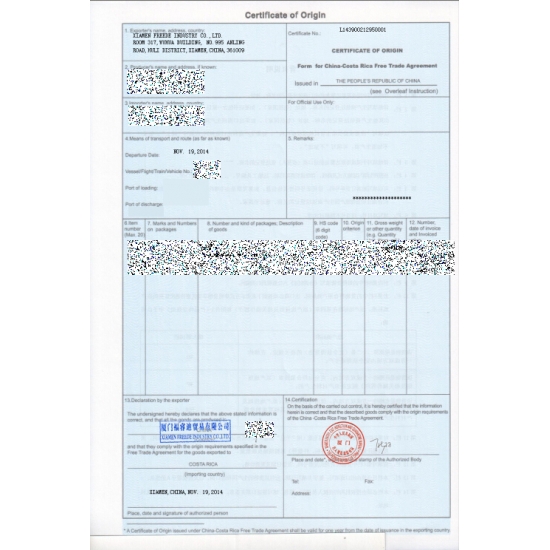 Certificate of Origin Form For Ching-Costa Rica Free Trade Agreement
